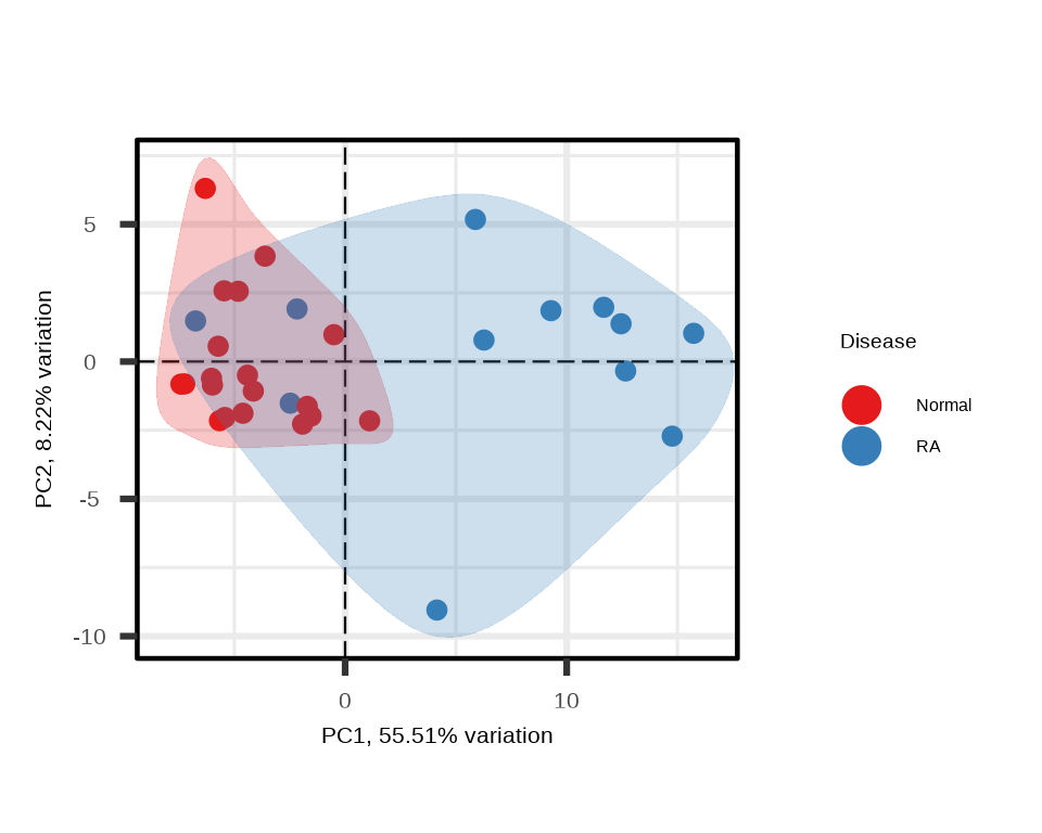 title = paste0("Rheumatoid Arthritis (RA) (n=", n_ra, ") \n vs Normal (n=", n_normal, ")"),