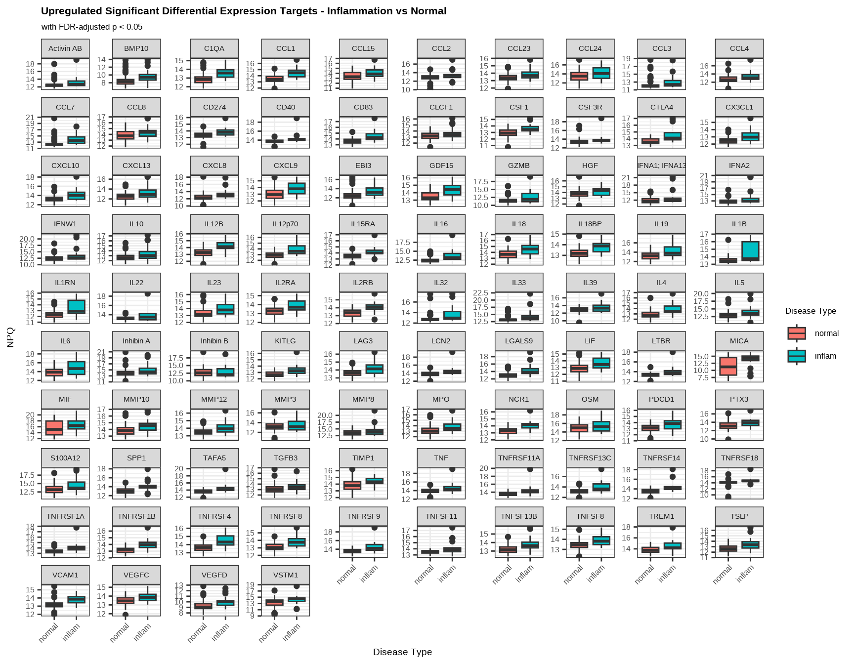 Boxplots show the expression distribution of each upregulated protein in Inflammation versus Normal samples. Higher mean NPQ in Inflammation samples confirm upregulation.