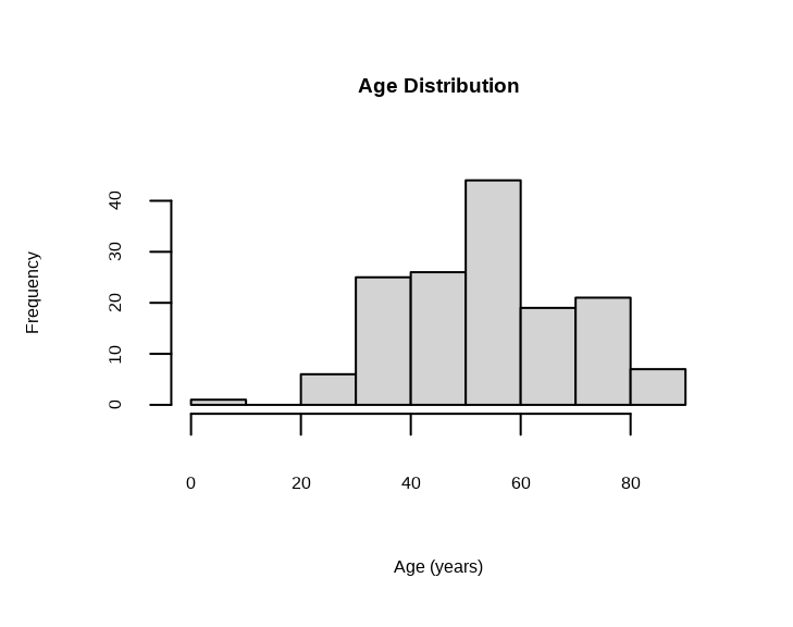 hist(metadata$age, main = "Age Distribution", xlab = "Age (years)")