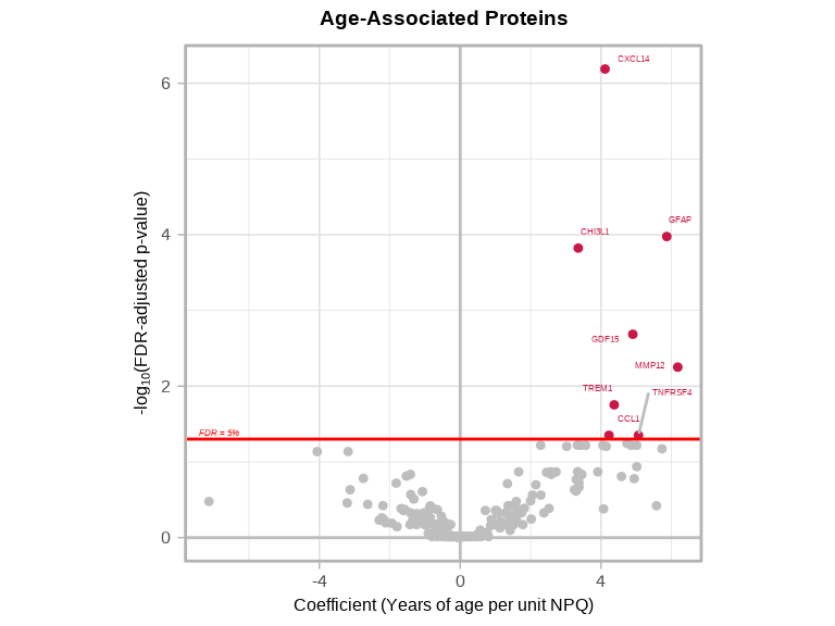cat("Number of proteins significantly associated with age:", nrow(age_proteins), "\n\n")#> Number of proteins significantly associated with age: 8